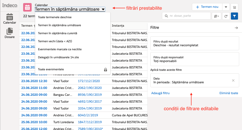 Existența interogărilor predefite gen: Termen în săptâmâna viitoare, Delegații ..., Dosare pe rol permit accesul rapid (cu 1 click) la informația dorită.