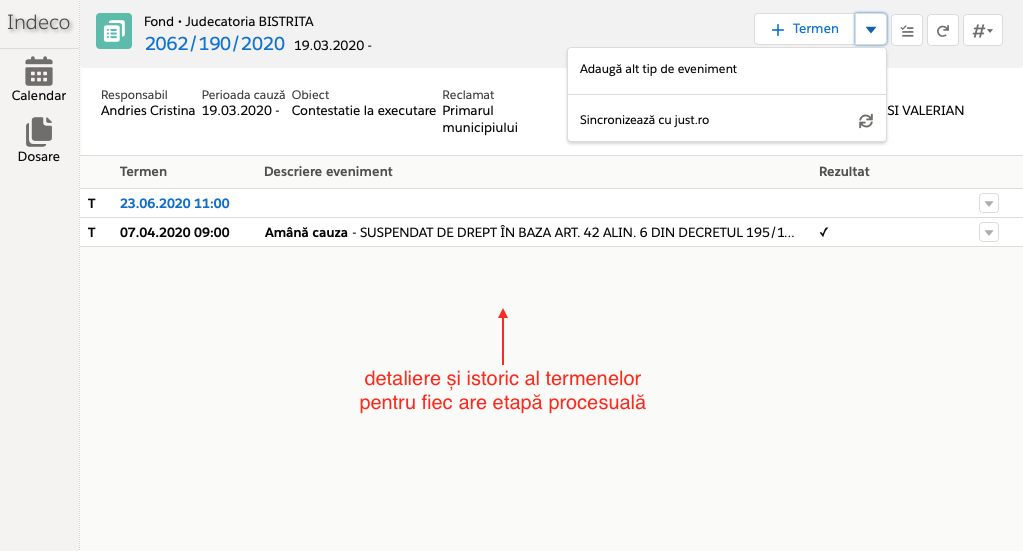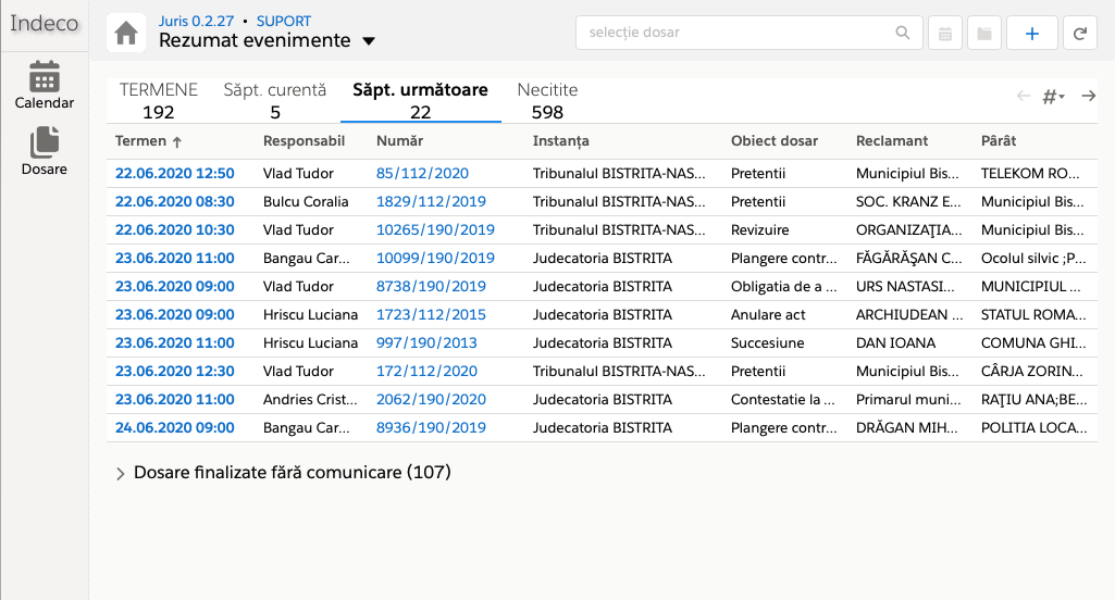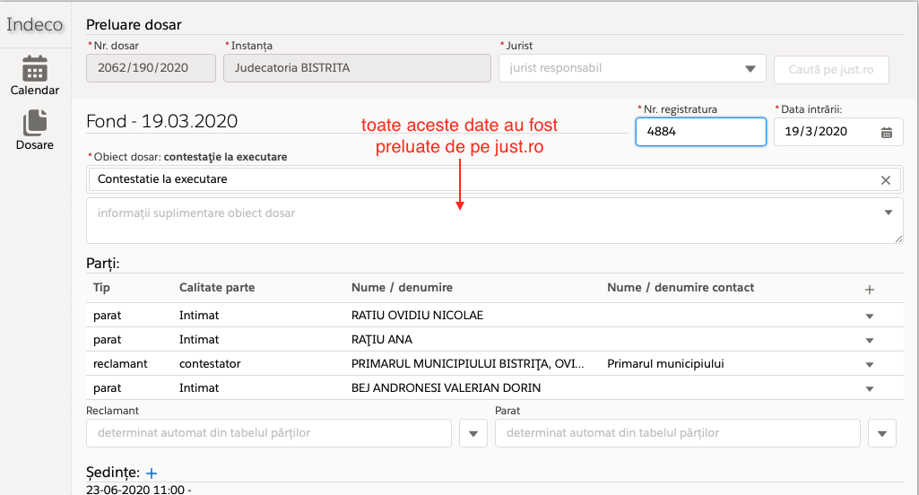 Preluarea dosarelor (cu toate proprietățile: obiect, părțile și calitățile acestora), preluarea automată a termenelor de pe portalul just.ro.